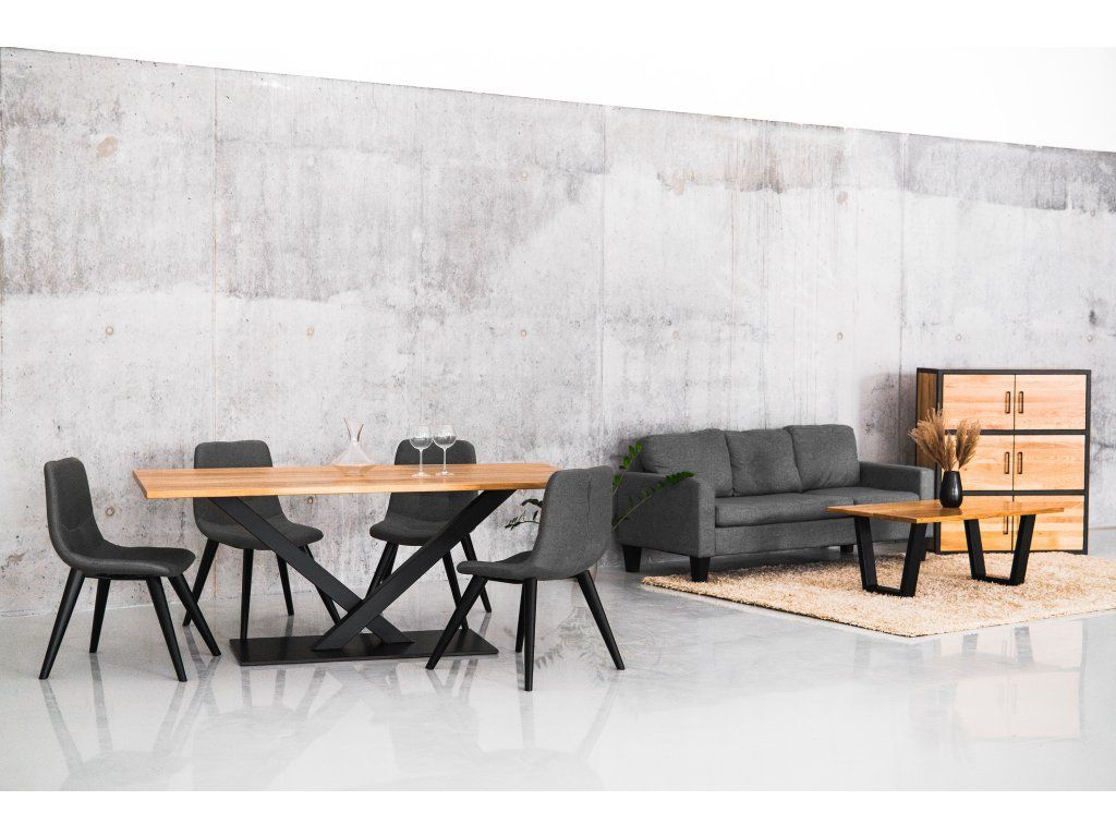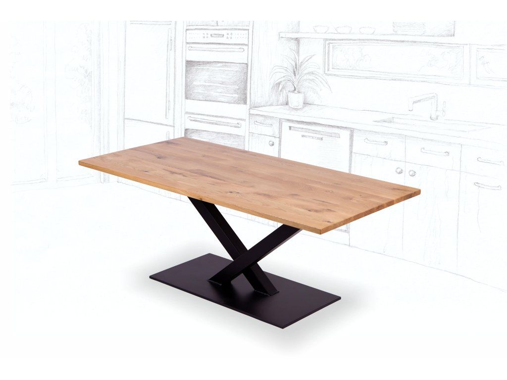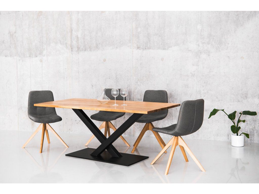 Jídelní stůl London z masivního dubu, vyrobený v České republice, zaujme svým jedinečným designem a zkříženými ocelovými nohami na černé podestě. Je velmi stabilní, těžký a stane se dominantou moderního interiéru, kde poslouží jako výrazný a odolný kus nábytku.