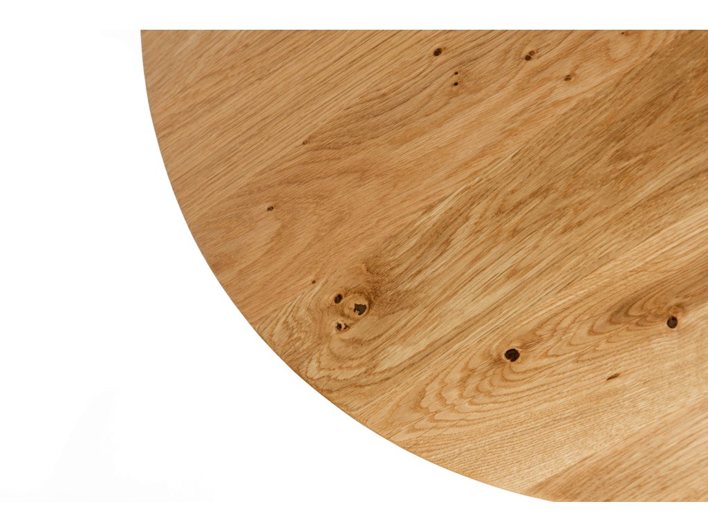 Drevený konferenčný stolík okrúhleho tvaru má industriálny vzhľad podporený masívnou doskou z duba v kombinácii s kvalitnou oceľou s čiernou povrchovou úpravou, z ktorej sú vyrobené netradične tvarované nohy. Masívny konferenčný stôl je vhodný do každého interiéru a dodá mu osobitý štýl. Vyznačuje sa elegantným vzhľadom, vzdušnosťou, praktickosťou aj prijateľnou cenou. Môžete ho navyše skombinovať s väčším okrúhlym jedálenským stolom v rovnakom dizajne a váš interiér bude dokonale ladiť. Konferenčný stolík s dubovou doskou je vyrobený z masívu, ktorý je známy svojou vysokou odolnosťou, tvrdosťou a životnosťou a pri vhodnom zaobchádzaní vydrží dlhé roky.